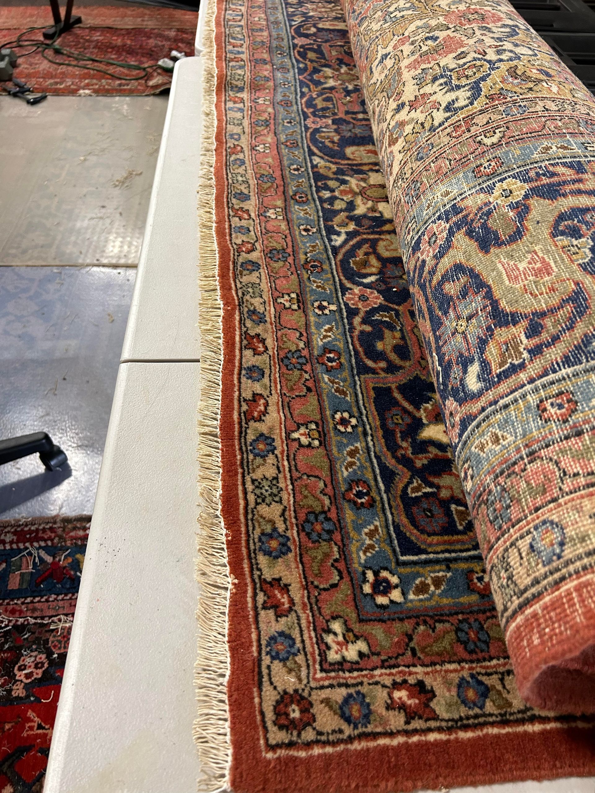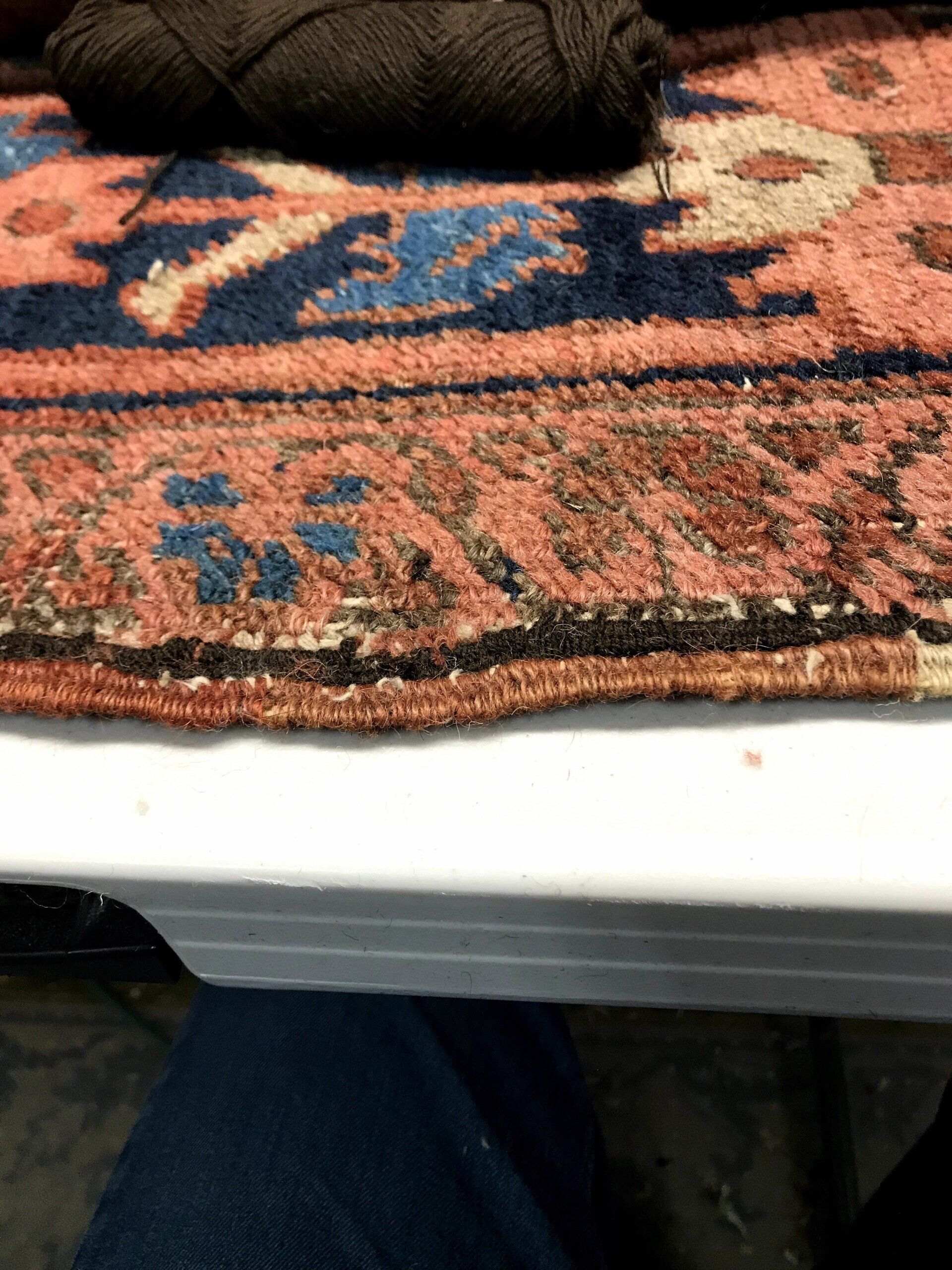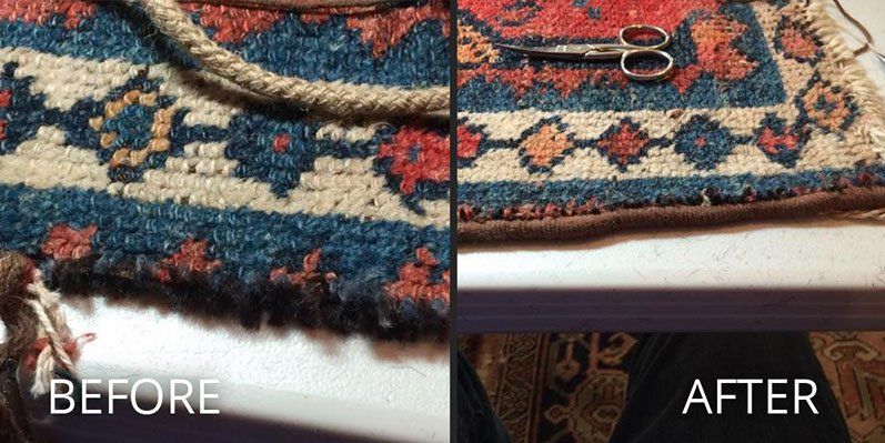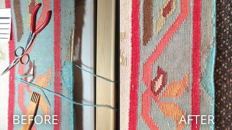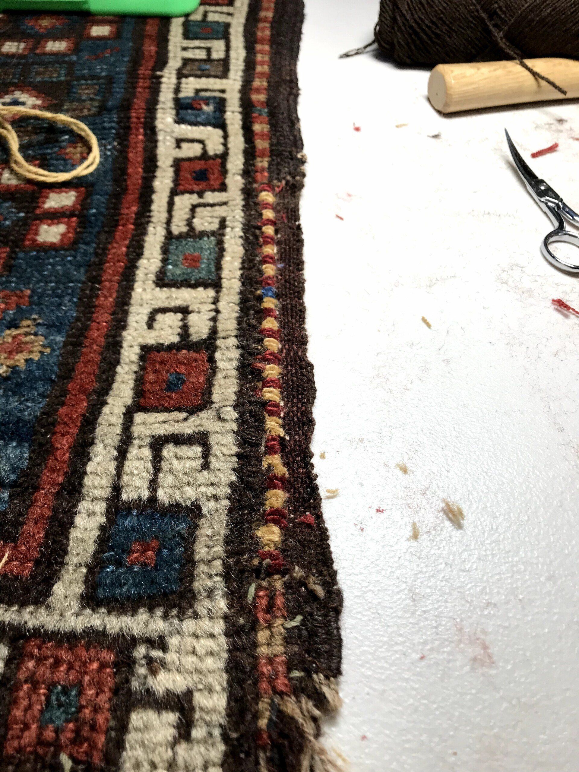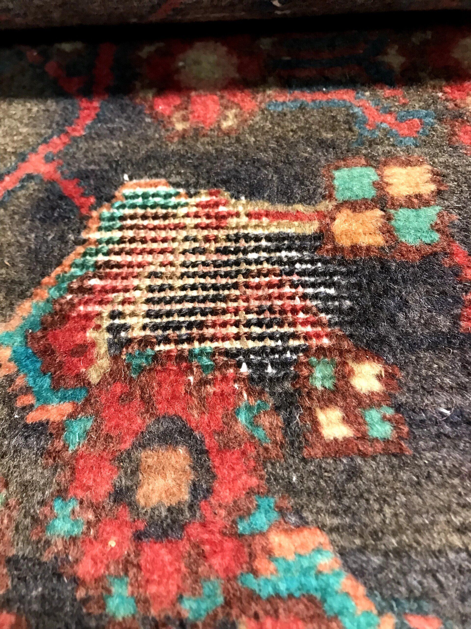 We offer rug repair for all handmade rugs and some machine made rugs. We can repair, remove or replace fringe on most rugs. We also offer repairs for small moth damaged areas, rips and tears, small holes, fringe end over casting and selvedge repair. We can shorten handmade rugs in most instances and re-weave small areas in most handmade rugs. We can correct color problems in most cases. Prices vary and a thorough exam of the rug is required for a repair quote. All of our repairs are done by hand at our repair shop.