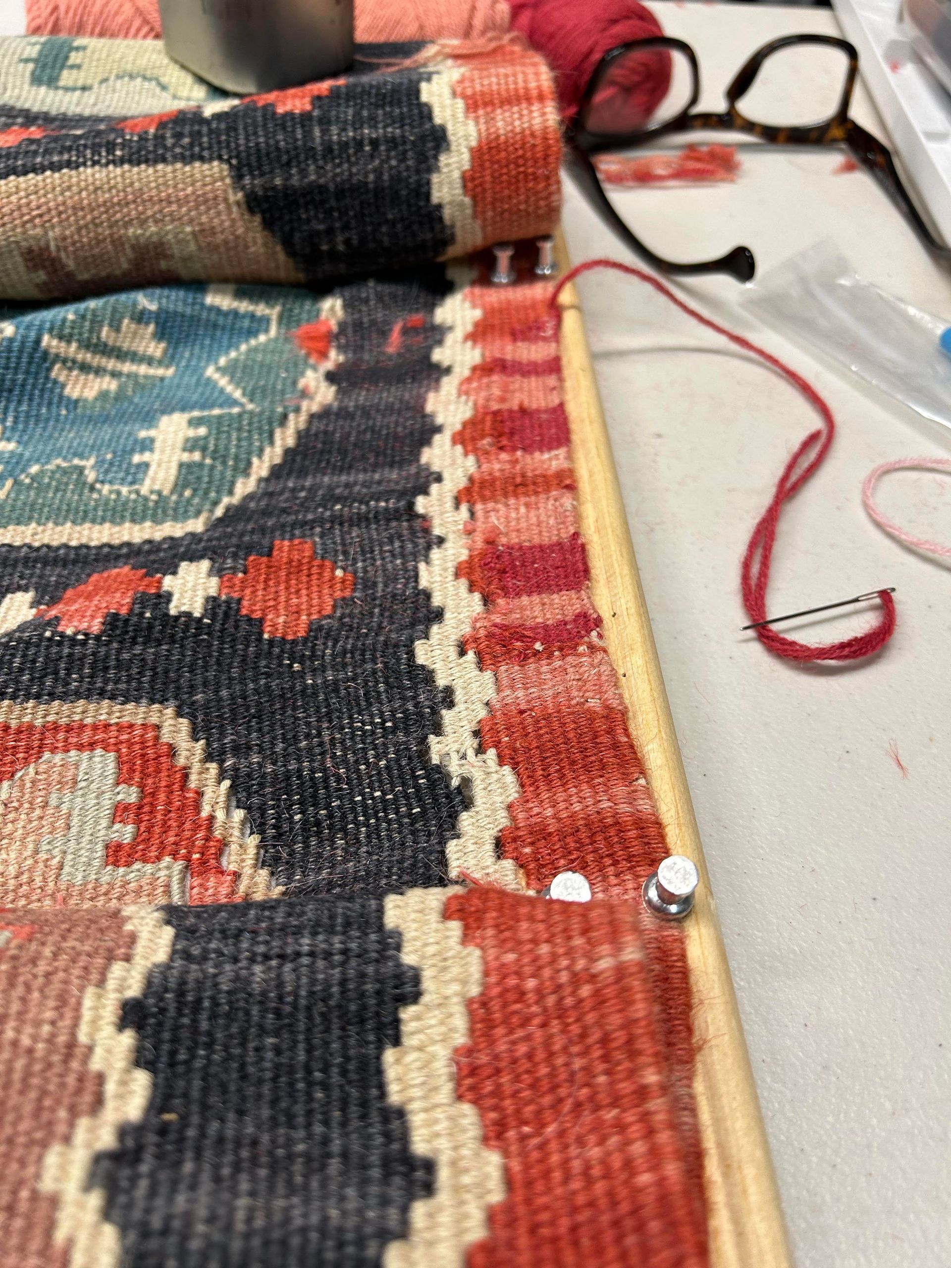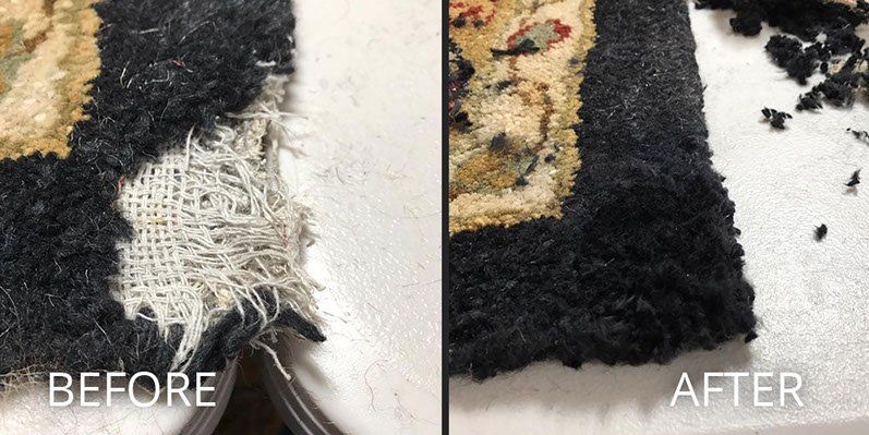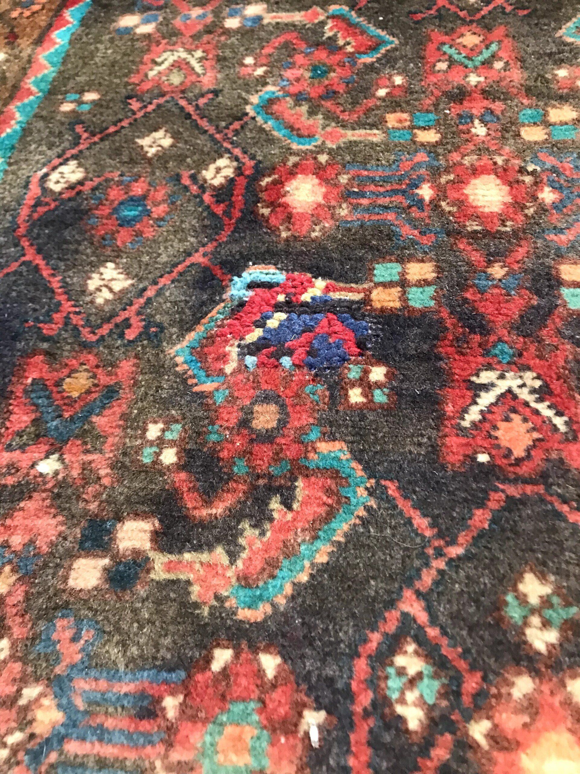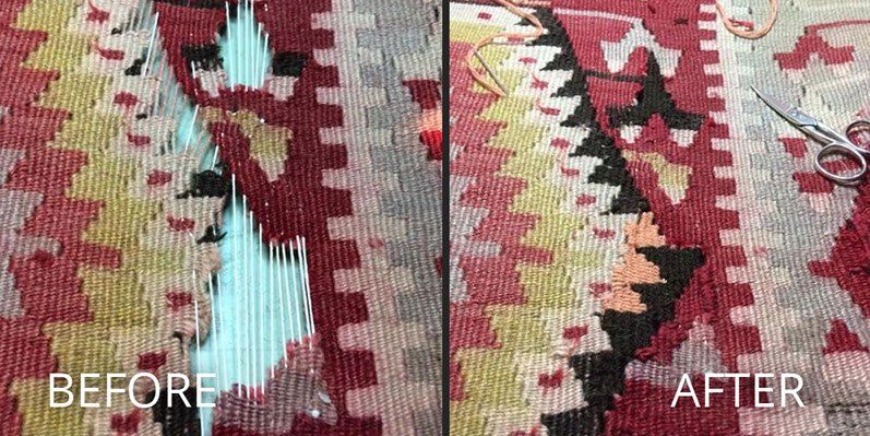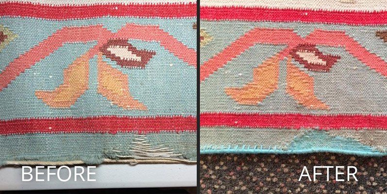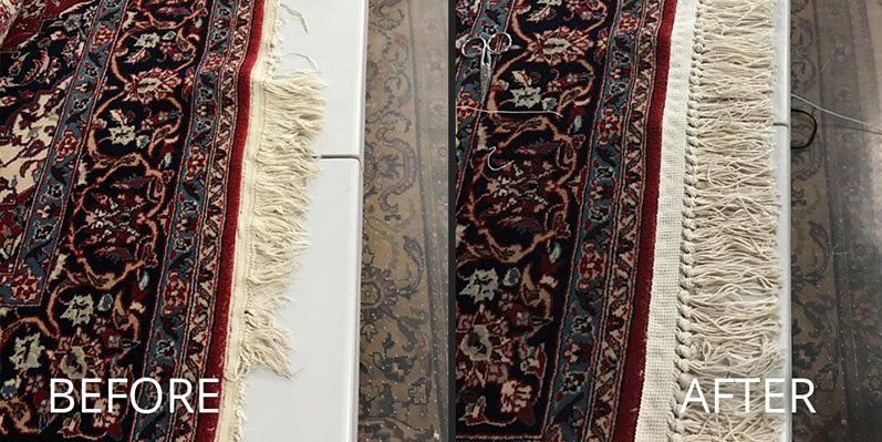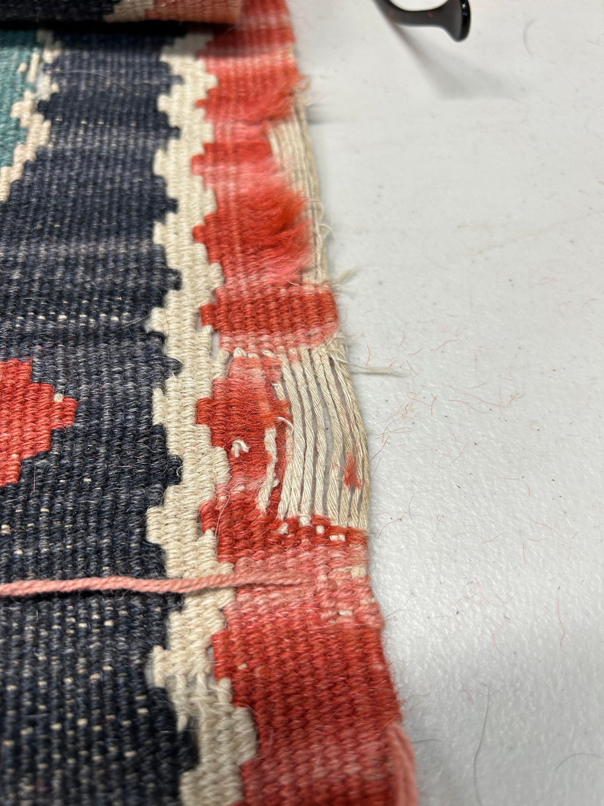 We offer rug repair for all handmade rugs and some machine made rugs. We can repair, remove or replace fringe on most rugs. We also offer repairs for small moth damaged areas, rips and tears, small holes, fringe end over casting and selvedge repair. We can shorten handmade rugs in most instances and re-weave small areas in most handmade rugs. We can correct color problems in most cases. Prices vary and a thorough exam of the rug is required for a repair quote. All of our repairs are done by hand at our repair shop.